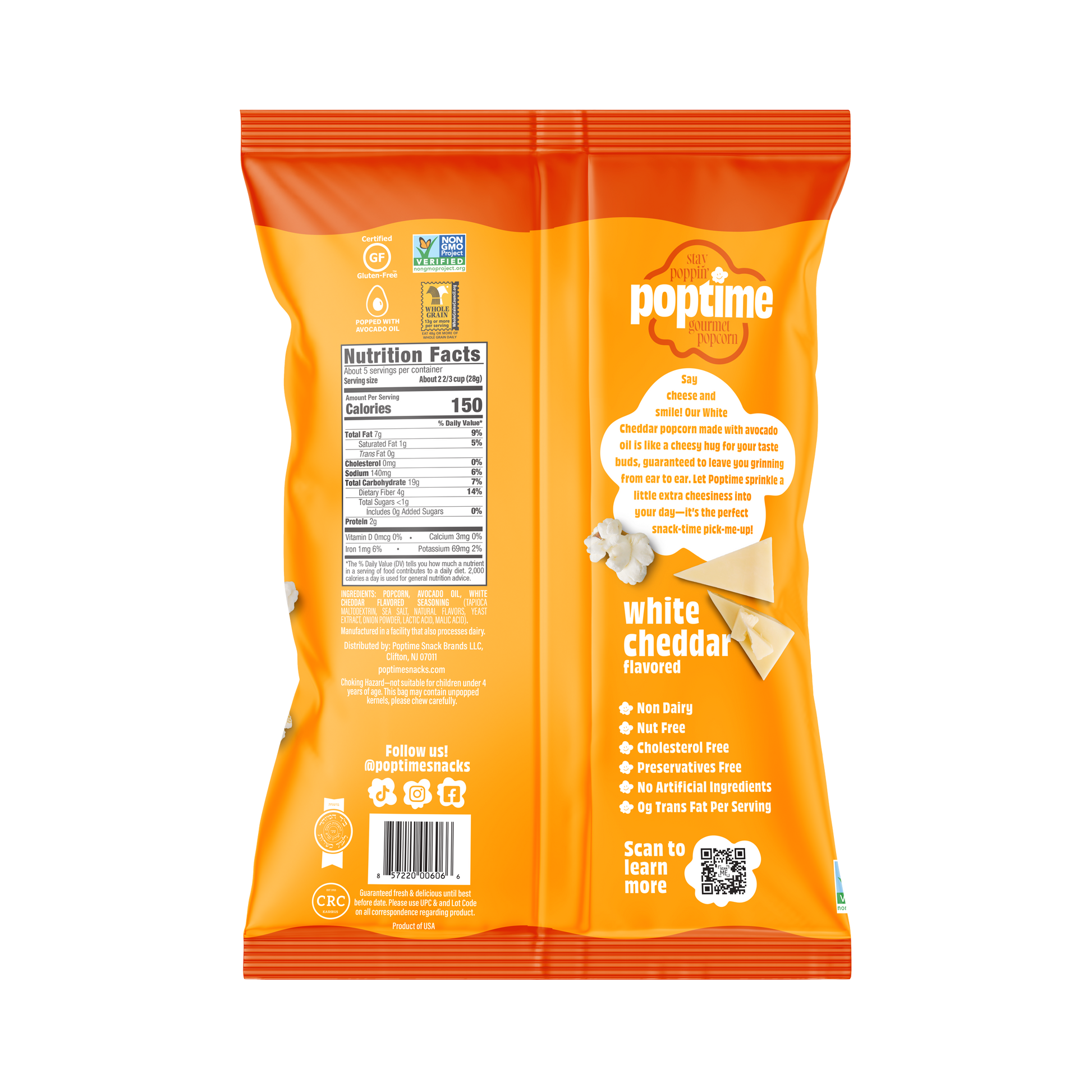 Say cheese and smile! Our White Cheddar popcorn made with avocado oil is like a cheesy hug for your tastebuds, guaranteed to leave you grinning from ear to ear. Let Poptime sprinkle a little extra cheesiness into your day—it’s the perfect snack-time pick-me-up